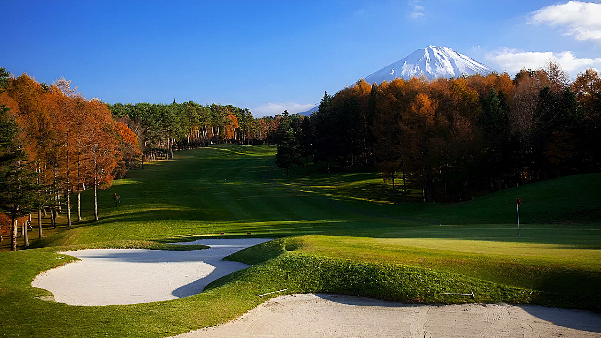 Forest Narusawa Golf & Country Club, established in 1986, is a semi-private 18-hole, par-72 course located in Narusawa, Yamanashi Prefecture, Japan. Designed by Okubo, the course spans 7,000 yards from the back tees and is set amidst groves of silver birch, Japanese zelkova, and pine trees at the foot of Mt. Fuji. The gently sloped terrain and expansive fairways, separated by natural tree groves, offer a relaxed yet strategic golfing experience. The bentgrass greens are closely guarded by bunkers and ponds, requiring precise approach shots. Facilities include a 10-bay, 100-yard driving range, clubhouse, restaurant, and electric carts that can be driven on fairways.
