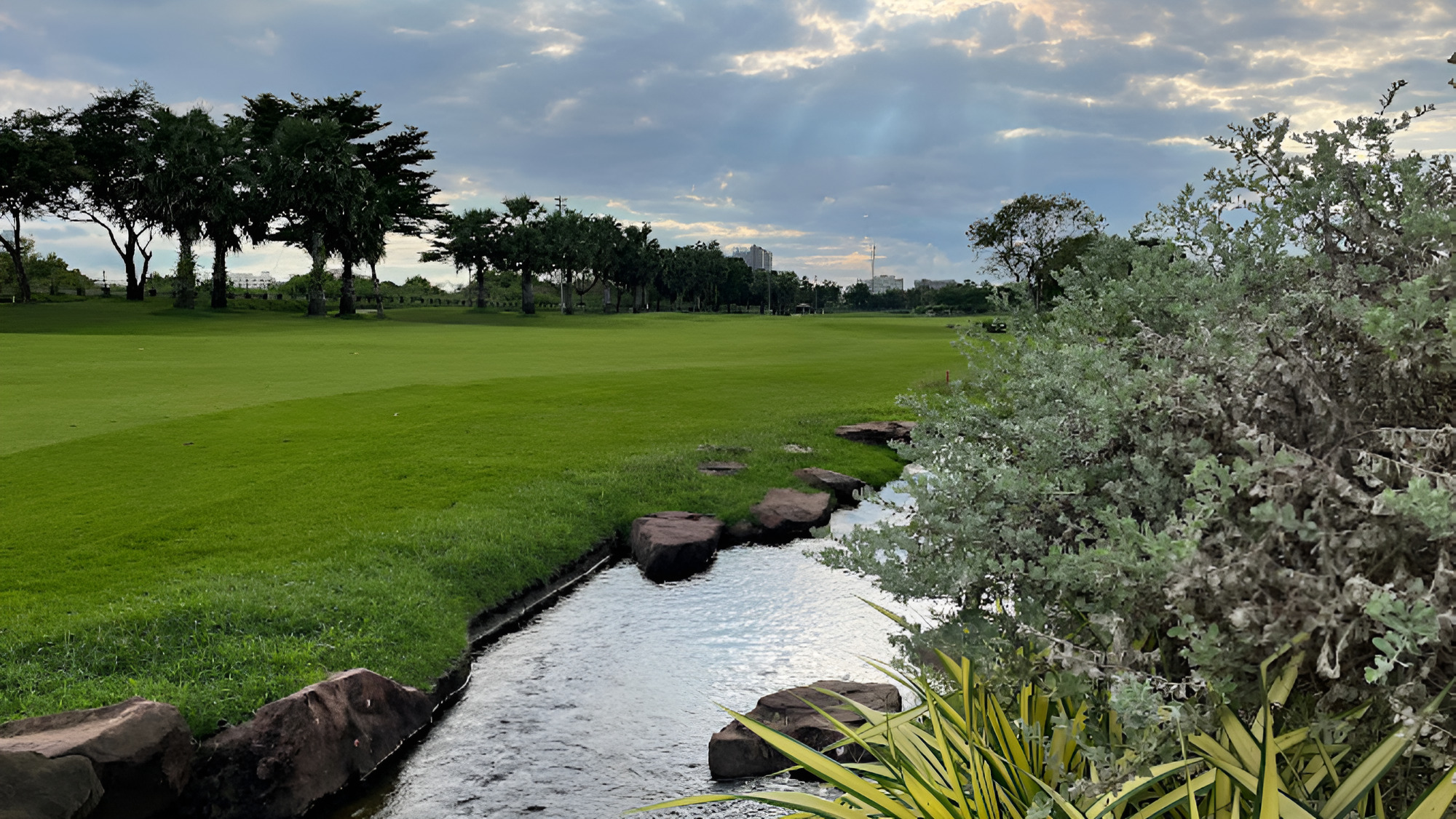 The 27-hole Panya Indra Golf Club designed by Ronald Fream & David Dale of the USA opened in 1991. The golf course is just off the Outer Ring Road, which makes for short travel times from Bangkok city center and is usually reachable in 30 minutes or less from most hotels. The courses aptly named are the Lagoon Course, Palm Course, and Garden Course. The golf course has been extensively landscaped with colorful flowering plants, shrubs, and bushes to provide beautiful backdrops to most of the holes. Fairways are palm tree-lined, and lakes and ponds come into play on almost every hole at Panya Indra. The deep bunkers have sculptured, and the smooth flowing lines of fairways give the course a natural feel in a city environment.