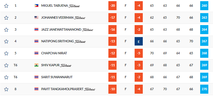 Home favourite Jazz Janewattanond had a chance to complete a successful title defence after reeling in three birdies from the 11th. However, he struggled to a dropped-shot on the last and left Tabuena running away with a three-shot victory.